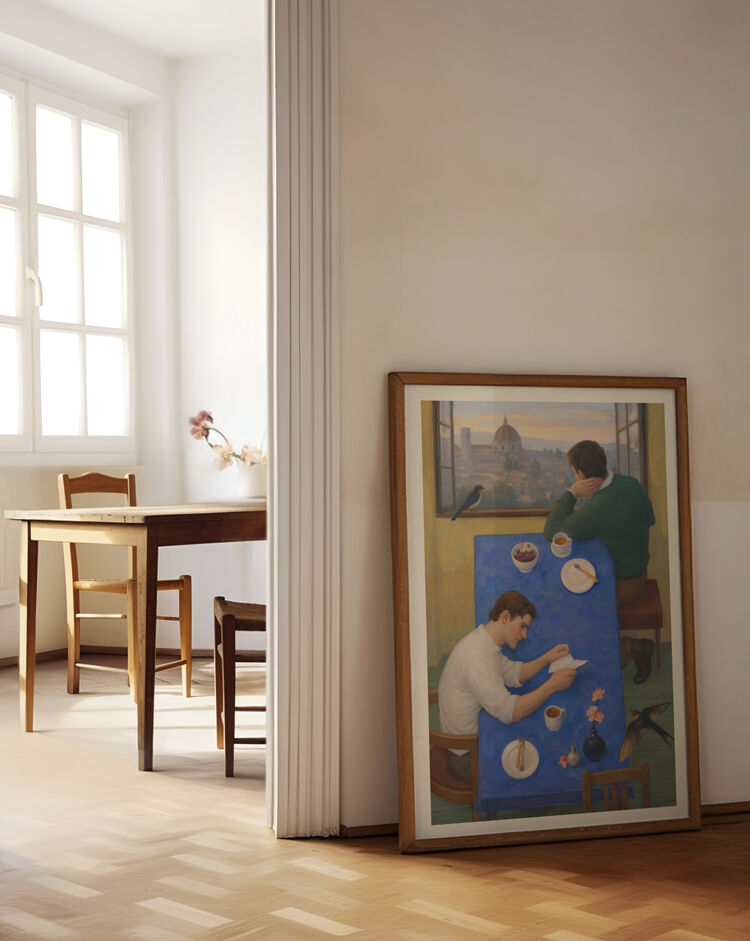 In Room with a View, Fernando Cidoncha invites us into a quiet, intimate moment. Two men sit at a table covered in deep blue, absorbed in their own thoughts. Nothing dramatic is happening — and that’s exactly the point. The scene feels suspended in time, somewhere between conversation and silence.